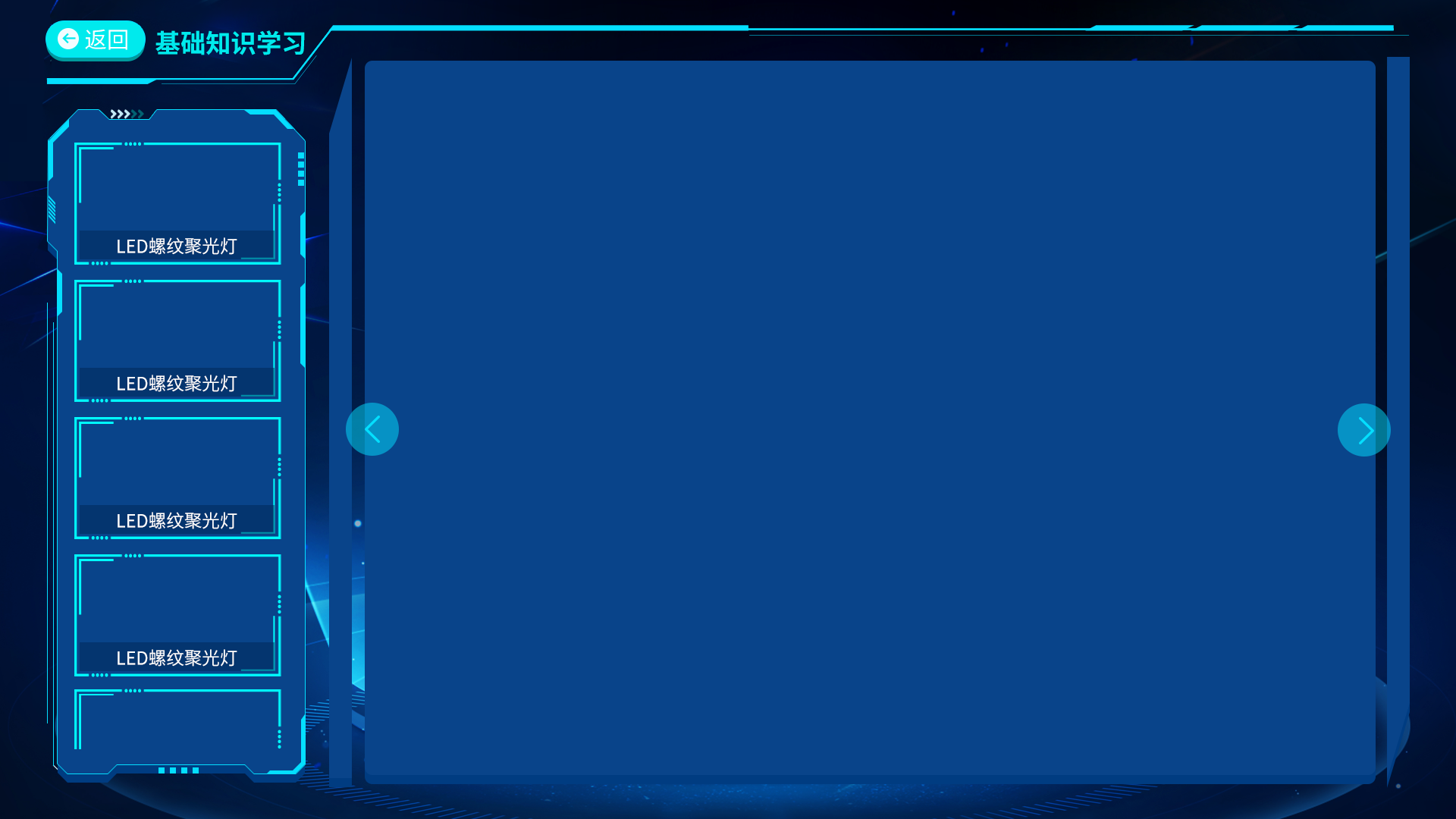 打开“设备及辅材的认知”模块,学生在该模块下可以看到灯光系统集成过程中涉及到的灯具、集成设备、辅材、工具等虚拟建模,使能够进行360°全方位观察。学生点击旁边的按钮可以看到不同设备的文字说明,部分灯具的结构示意图以及动画展示,提示该器件的参数选择方法,应用环境、使用注意事项等信息,让学生对这些器件的外形产生深刻的印象,日后到现场能够准确的识别出来。